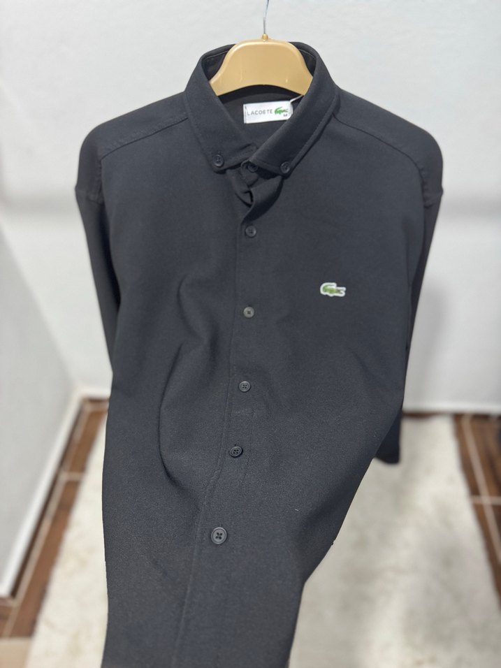 Lacoste siyah renkte, düğmeli önü ve kesik yaka detaylı, uzun kollu, rahat kesim erkek gömleği. Günlük sokak stiline uygun.
