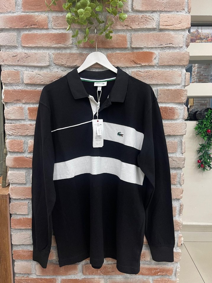 Lacoste marka, pamuklu, uzun kollu, düğmeli, yakalı ve baskılı yatay çizgili siyah erkek polo tişört. Rahat ve bol kesimdir.