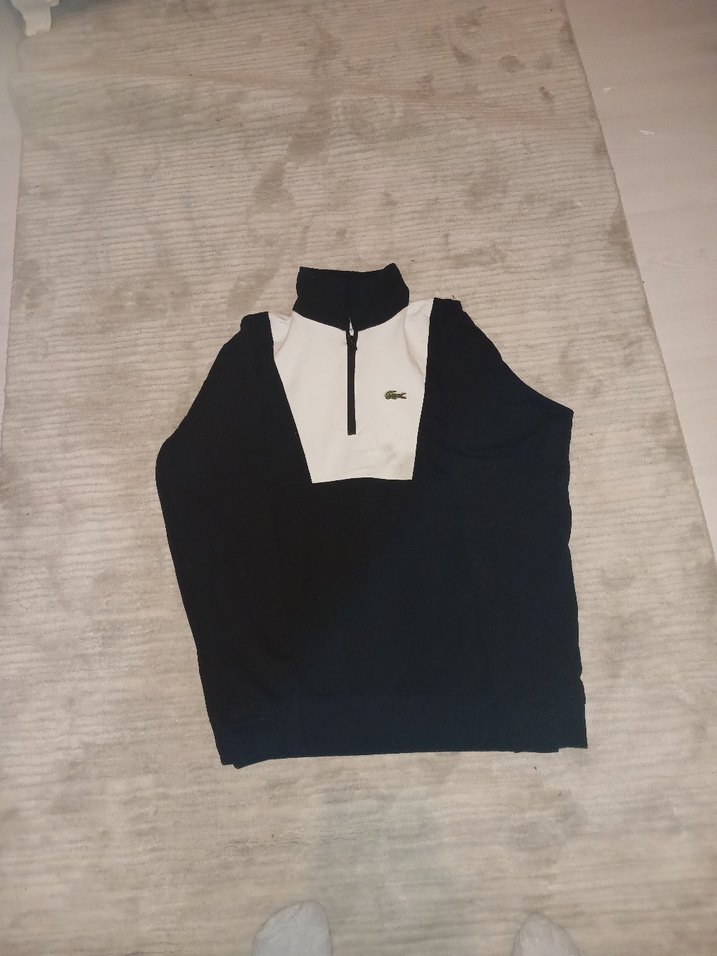 Yarım fermuarlı, yüksek yakalı, siyah erkek sweatshirt. Beyaz panel ve Lacoste logosu bulunur. Yumuşak ve sıcak kumaştan üretilmiştir.