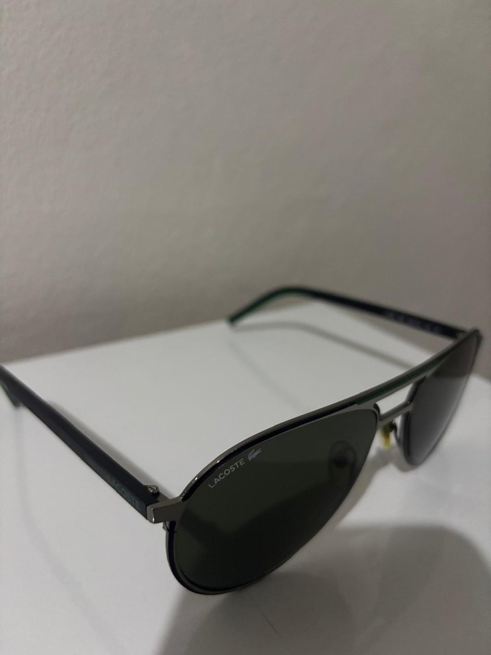 Fotoğraftaki gözlük Lacoste marka, koyu camlı ve metal çerçeveli (pilot tarzına yakın) bir model. Ayrıca çok kullanılmadı deformasyon yok.