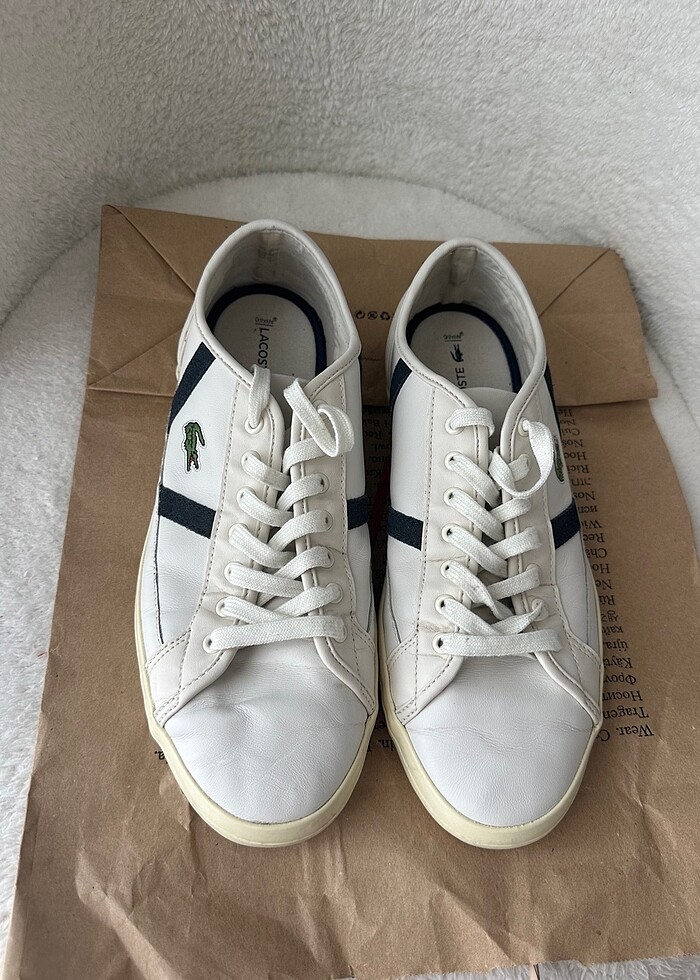 Lacoste sneaker spor ayakkabı . Orijinaldir. Temiz birkaç kereden fazla giyilmedi altındaki sarılıktan hoşlanmıyorsanız beyaz boya ile boyanabilir. Lacoste kutusu da mevcut