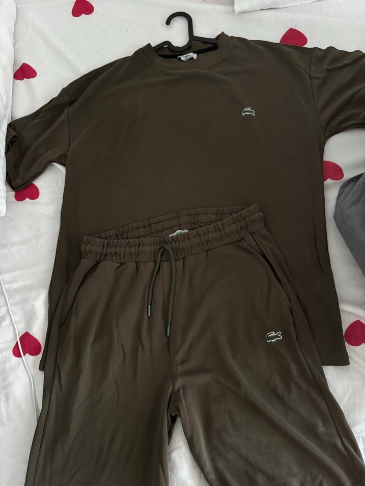 Erkek takım, kısa kollu ve yuvarlak yakalı, kahverengi ve oversize kesimle rahat ve şık bir görünüm sunar. Desensiz tasarımıyla trend casual ve athleisure tarzlara uygundur.