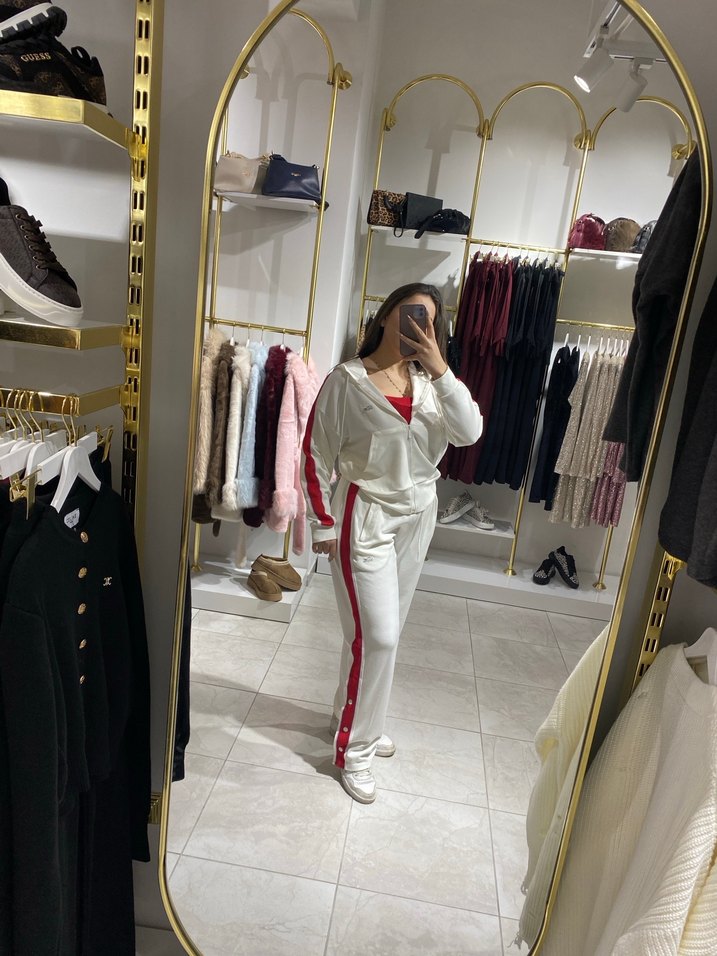 Pamuklu kumaştan, uzun kollu beyaz eşofman takımı. Yanlarda kırmızı çizgiler ve V yakaya sahip, rahat kesimiyle günlük kullanıma uygun.