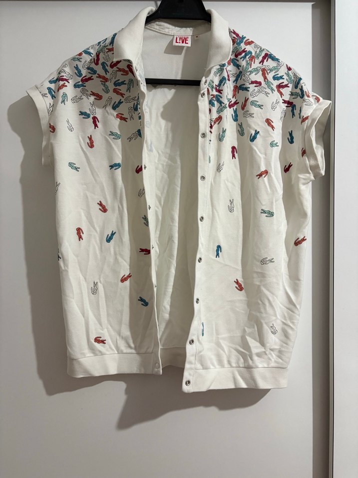 Lacoste orjinal live m beden Pamuk kumaştan, düğmeli ve yakalı, renkli baskılı beyaz kısa kollu, bol kesim kadın gömleği. Günlük kullanıma uygun, rahat ve şık.