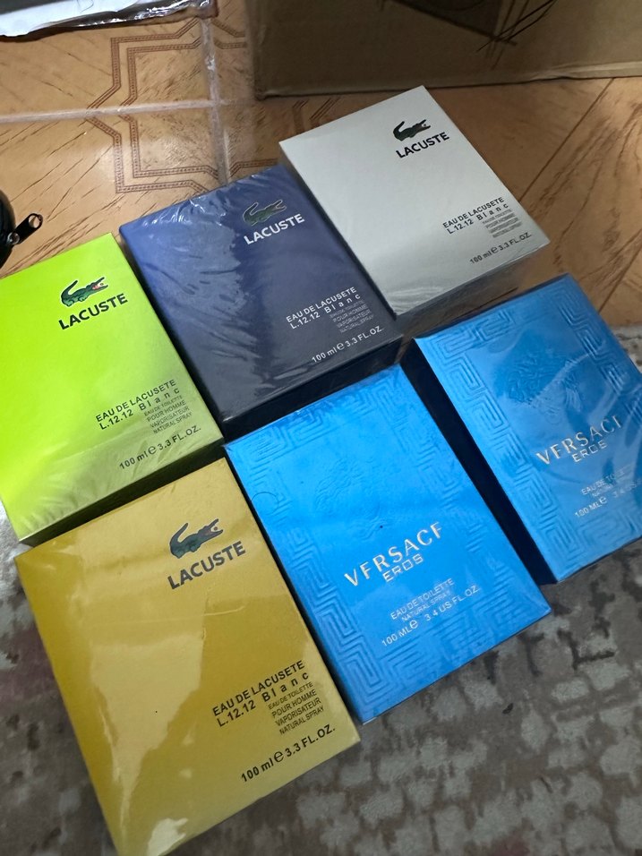 Farklı renklerde Lacoste ve Versace 100 ml erkek parfümleri, çağdaş iş tarzına uygun ferah ve canlı kokular içerir.