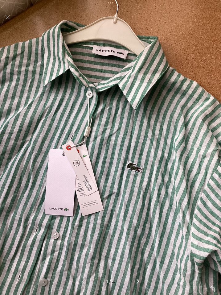 Lacoste çizgili, %100 keten kumaştan, uzun kollu, düğmeli, rahat kesim yeşil gömlek. 38-40 bedene uygun