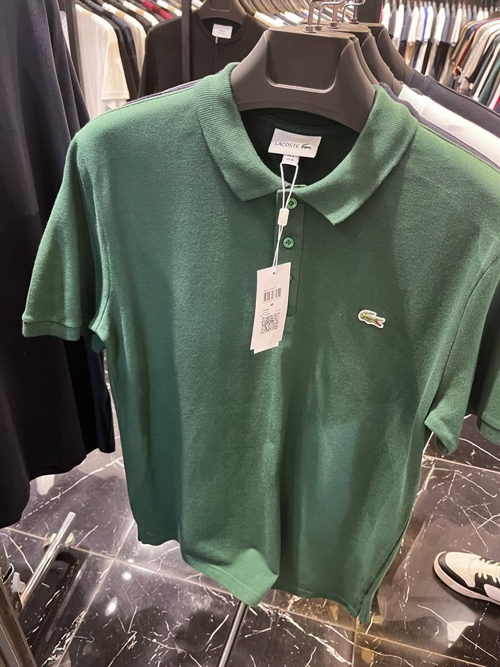 Yeşil renkli Lacoste polo tişört, yakalı ve kısa kollu, bol kesimdir. Parlak sentetik kumaştan üretilmiş, rahat sokak stili için uygundur.