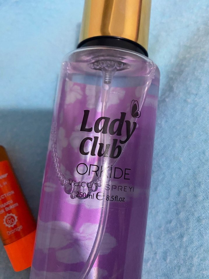 Lady Club Orhide kadın parfüm spreyi, 250ml kapasitede ve çiçeksi kokuya sahip. Şeffaf mor şişede, altın kapaklı.