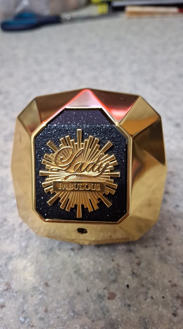 Altın renkli, keskin hatlı şişede Lady Fabulous kadın parfümü. Siyah ve altın etiketle şık bir koku kutusu.