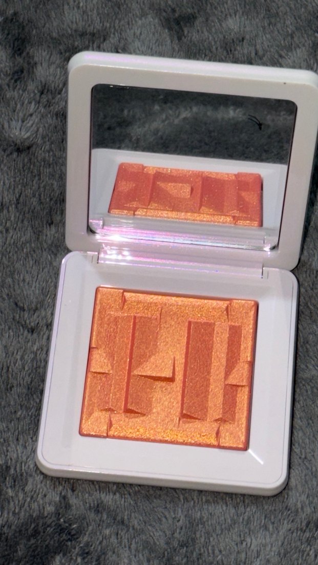 Parlak desenli geometrik desene sahip bej allık, aynalı kompakt kutuda. Yanaklara ışıltılı bir görünüm verir.