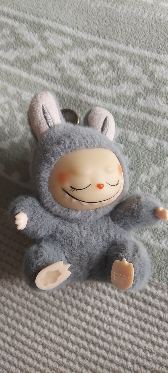 Lafufu yumuşak dokulu, gri renkli peluş tavşan figür. Kapalı gözlü ve gülümseyen yüz ifadesiyle küçük ve sevimli bir oyuncak.