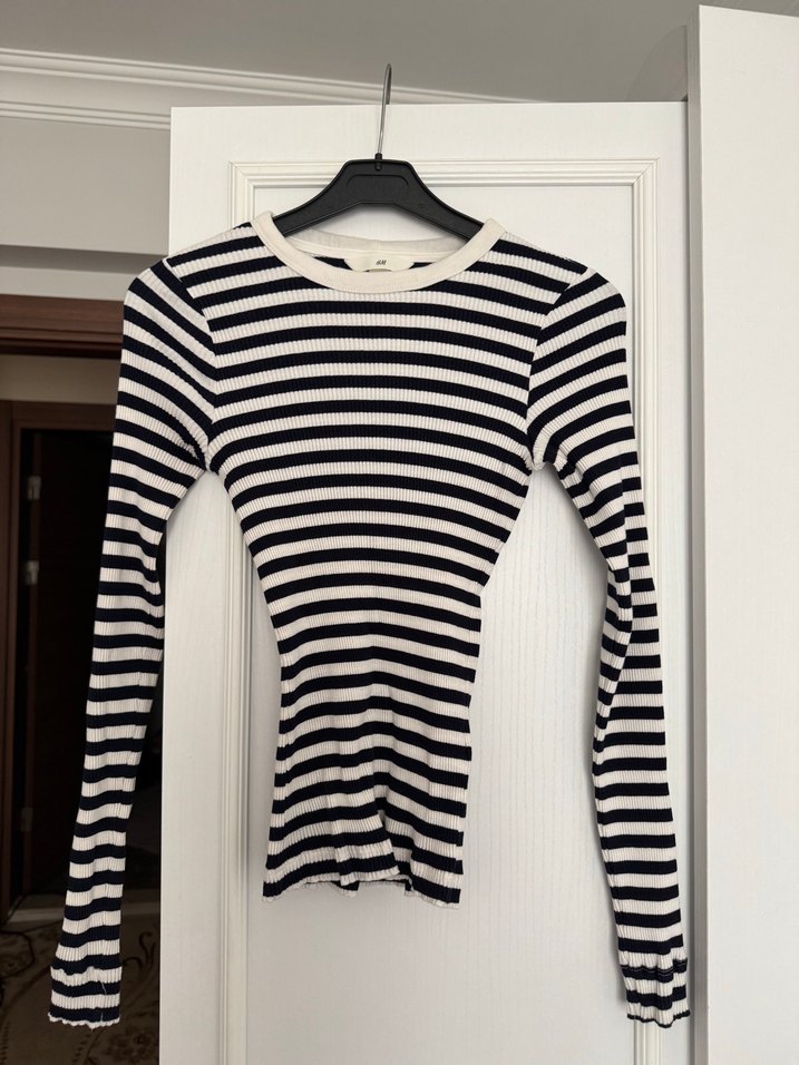 Lacivert beyaz çizgili, uzun kollu, triko kumaştan, tekne yaka ve dar kesim body Trendy casual tarz için uygun.
