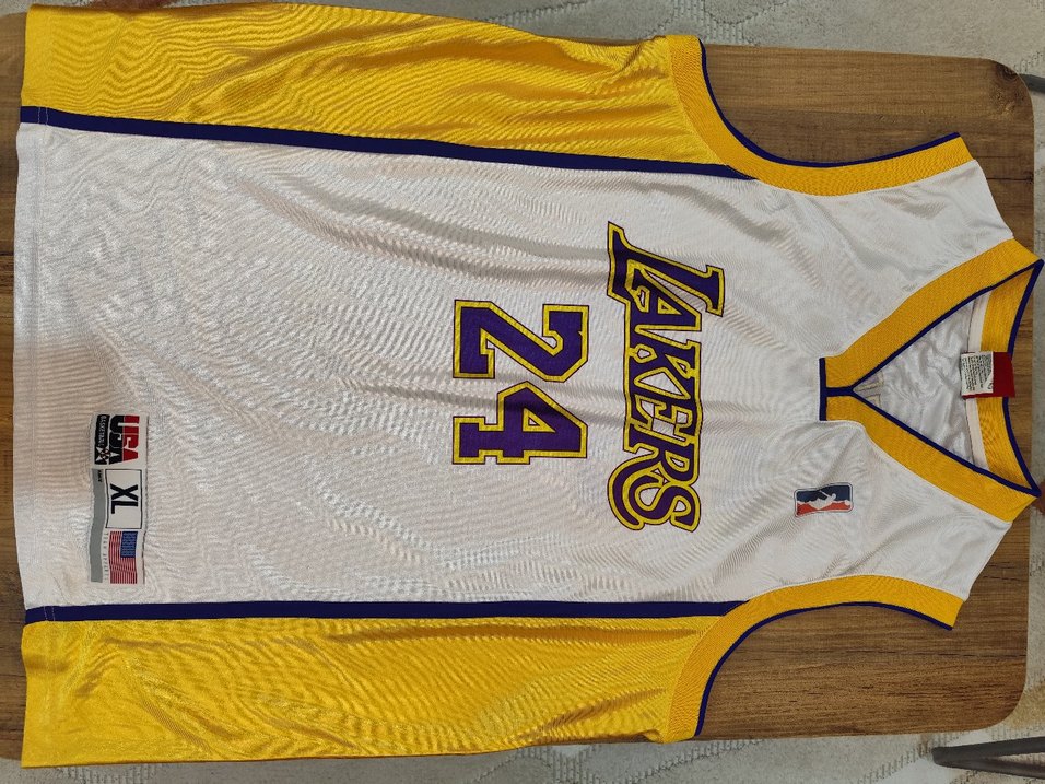 Sarı renkli, bisiklet yaka ve fermuarlı detaylı erkek atlet forması. Lakers baskılı, 24 numaralı, spor ve sokak tarzına uygun çok küçük kusurları var.