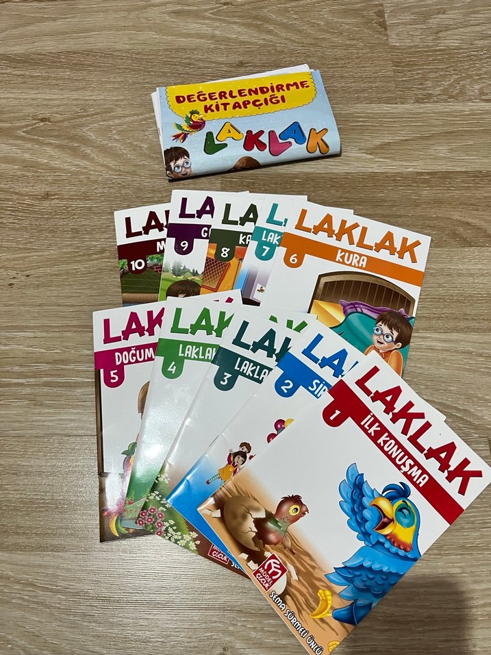 Laklak çocuk kitap seti, ilk konuşma ve doğum gibi konuları içeren 10 renkli kitaptan ve değerlendirme kitapçığından oluşur.