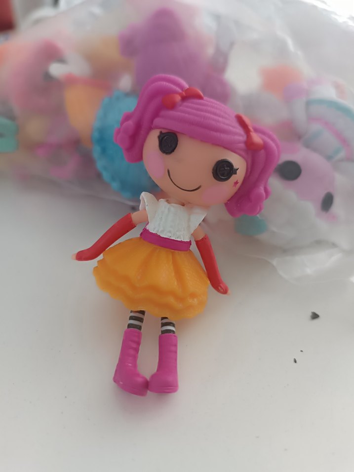 Pembe saçlı, beyaz üst, turuncu etek ve pembe botlu renkli oyuncak bebek. Gülümseyen yüzü ve çizgili çorapları vardır. orjinal mini lalaloopsy bebek yurtdışı ürünüdür çoklu alımlarda lütfen ürün birleştirme isteyin