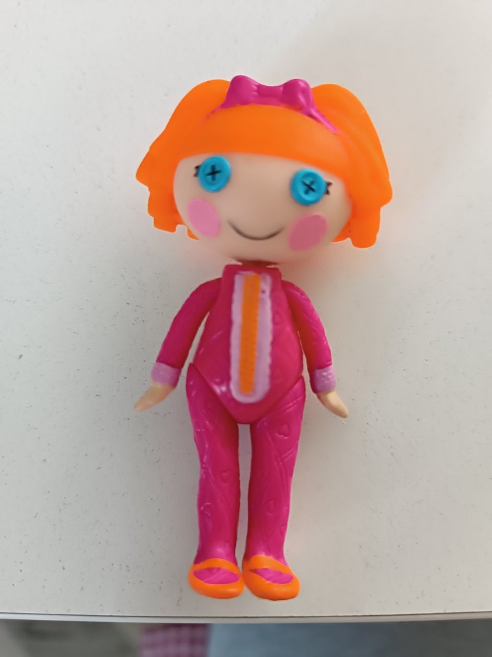 Pembe kıyafetli, turuncu saçlı, mavi düğme gözlü renkli bebek figürü. Yüzünde neşeli bir gülümseme ve başında fiyonk bulunur. orjinal mini lalaloopsy bebek yurtdışı ürünüdür. çoklu alımlarda lütfen ürün birleştirme isteyin
