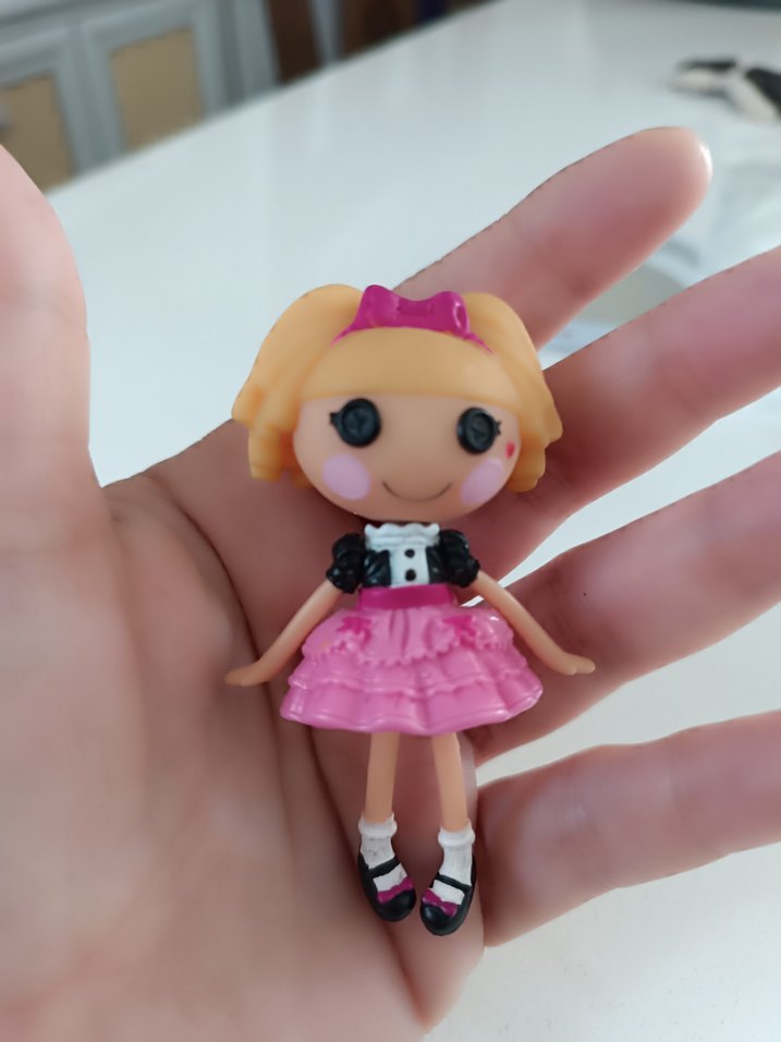 Sarı saçlı, pastel pembe katlı etekli ve siyah-beyaz üst giyimli küçük bebek. Sevimli yüz ifadesi ve siyah ayakkabıları var. orijinal yurtdışı ürünüdür çoklu alımlarda lütfen ürün birleştirme isteyin