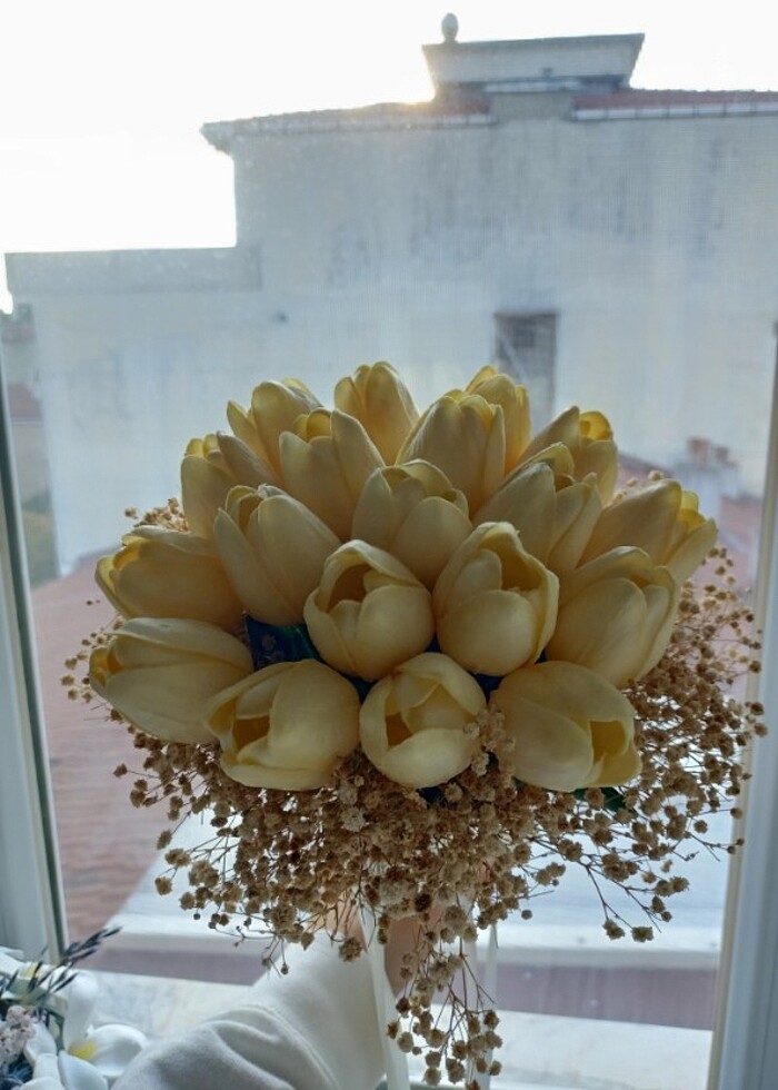 Lale buketi, hafif Sarı tonlarındadır. Kendi nikahımda kullanmıştım. Defosu yoktur. €lden✓