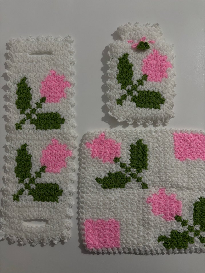 Beyaz zemin üzerine pembe güller işlenmiş, farklı şekillerde el örgüsü set. Yumuşak ve narin dokuda.