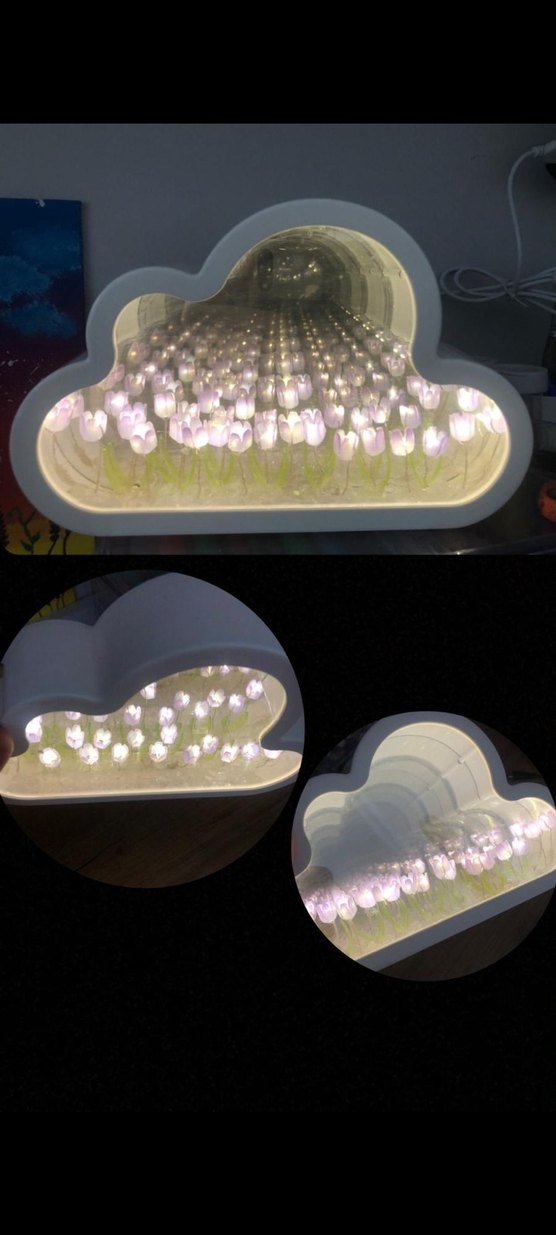 Beyaz bulut şeklinde LED ışıklı lamba, sonsuz lale yansıması efektiyle yumuşak ve dekoratif bir aydınlatma sağlar.