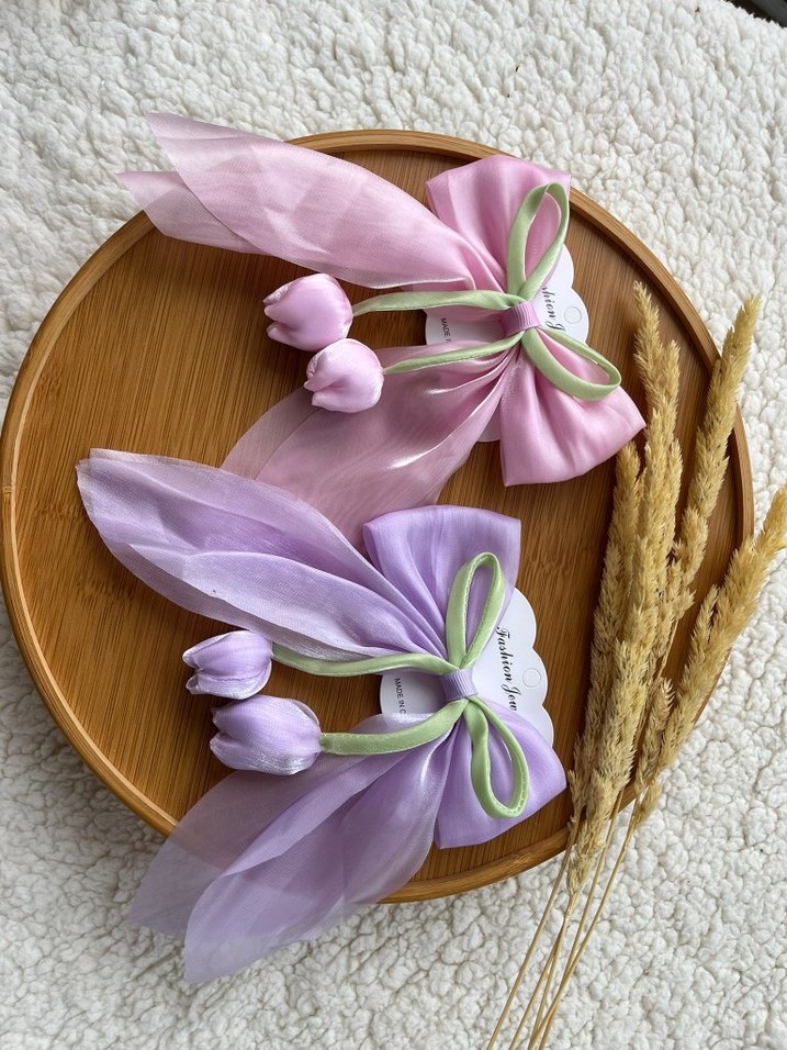 Bohem tarzda, mor ve pembe pastel renkli, çiçek desenli fiyonklu ve laleli saç tokası
