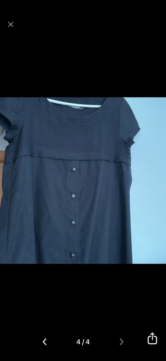 Siyah renkte, keten kumaştan yapılmış, düğmeli ve kısa kollu hamile midi tunik. Salaş kesimi ve kayık yaka detayıyla günlük kullanıma uygundur.