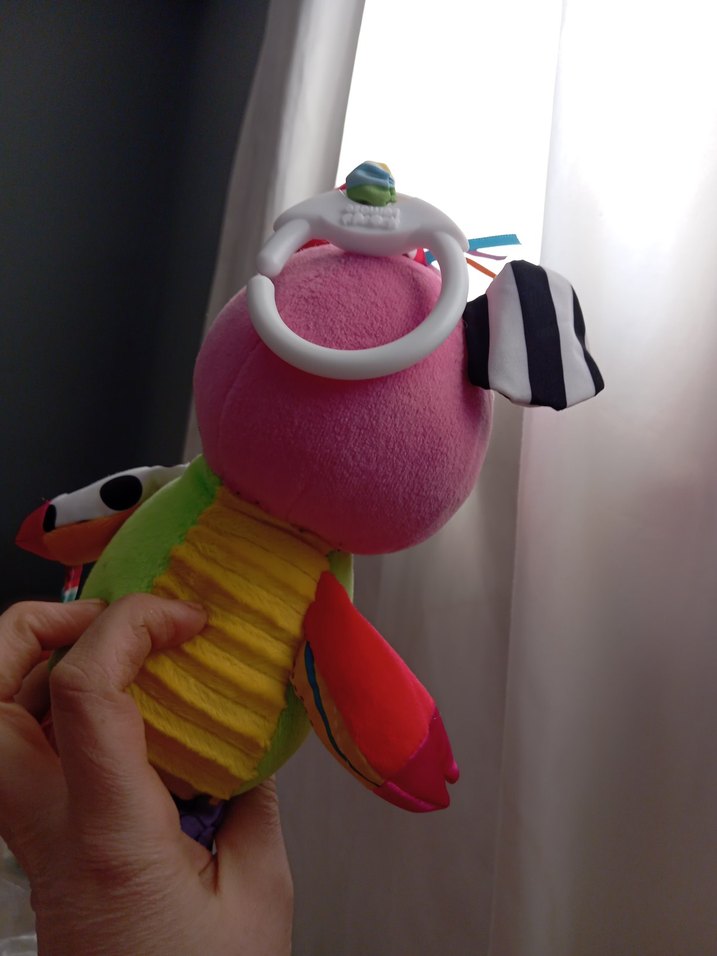 #lamaze Yumuşak ve renkli kumaştan yapılmış, kolay tutulan halkalara sahip diş kaşıyıcı ve çıngırak oyuncak.