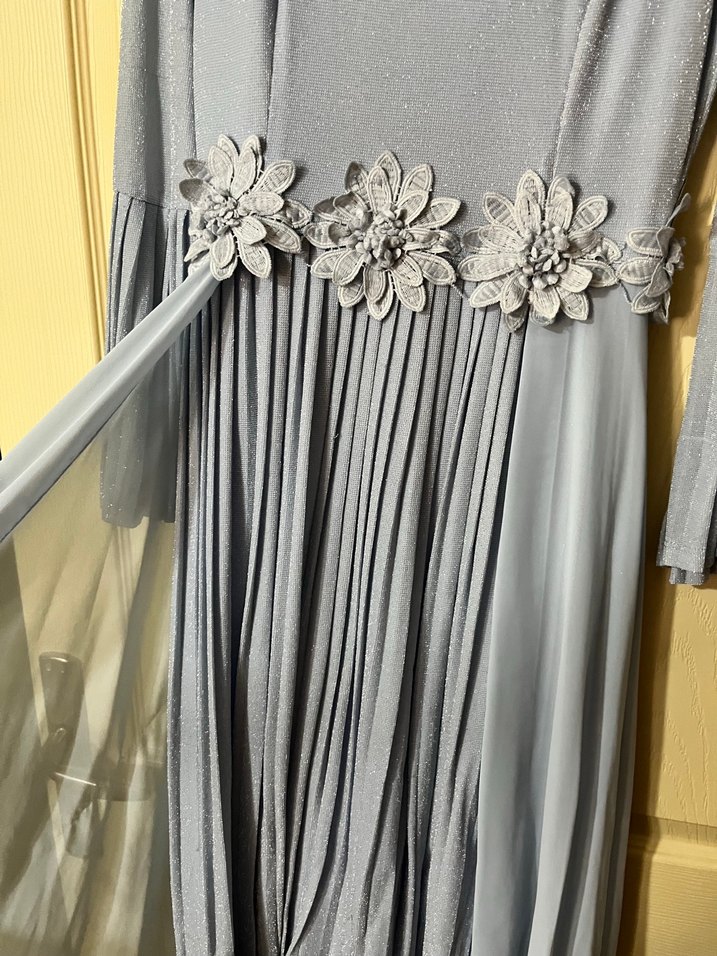 Buz mavisi renkli kolları ve etekleri piliseli uzun etekli abiye. Belindeki çiçek detayları ayrı bir hava katıyor. Kollarındaki piliselerde çok güzel bir görünüm veriyor.38 beden 36-38 bedene rahatlıkla olur.