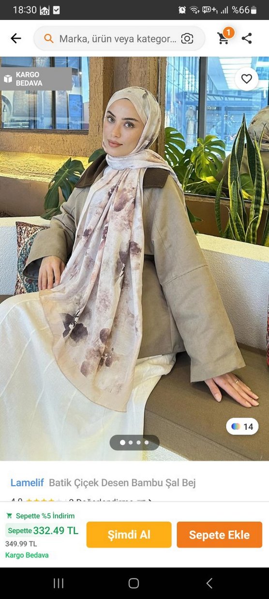 Bej renk bambu kumaş lamelif markalalı hiç giyilmedi penye şal kullandığım için takamadım ben etiketi çıkardığım için iade de yapamadım