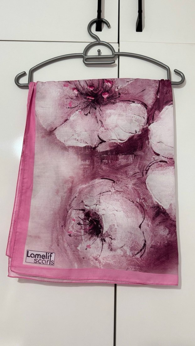 Lamelif pembe şal, yumuşak sentetik kumaş ve pastel çiçek desenli, çağdaş ve minimalist tarzda drapeli tasarıma sahiptir.
