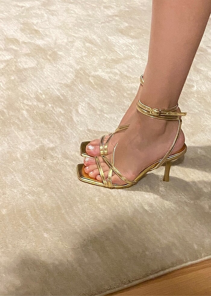 Laminta gold topuklu bantlı sandalet