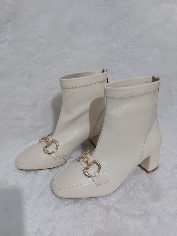 Detaylar görsellerde mevcuttur, Krem deri, blok topuklu bilekte botlar, kemerli detay ve hafif yılan derisi deseni ile. Klasik zarafeti modern dokunuşla günlük kullanıma uygun.