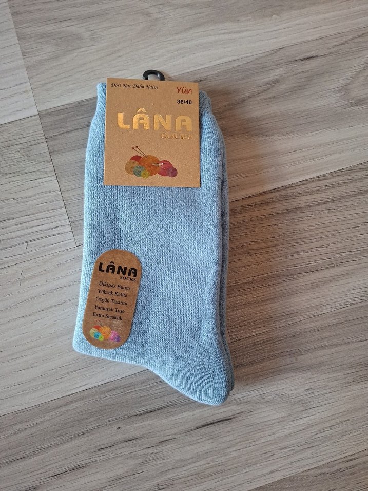 Lana markasına ait pastel mavi renkte, yumuşak yün kumaştan üretilmiş, rahat gevşek kesim midi çorap, 36/40 beden. karısık renklerde yün sıfır corap bayan ve erkek tır satıs fiyatı 1 tek urun içindir .