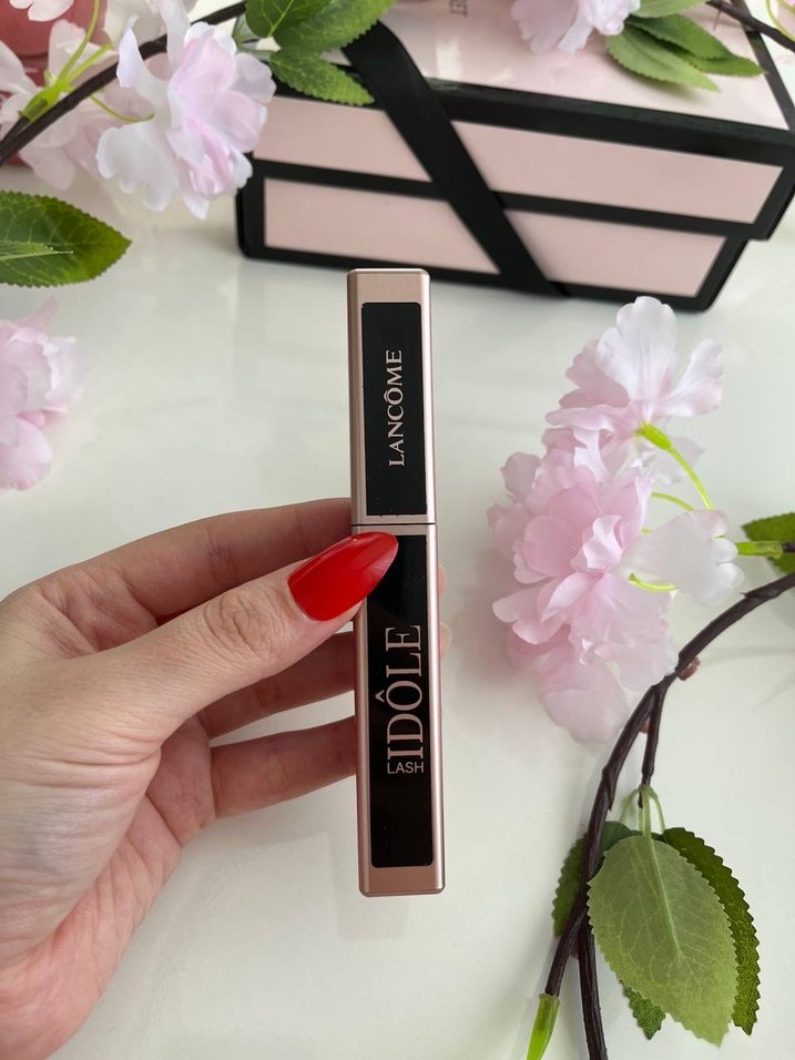 Lancôme Idôle Lash maskara, koyu pembe renkte, şık tasarımlı. Kirpikleri zengin renk ve hacimle belirginleştirir.