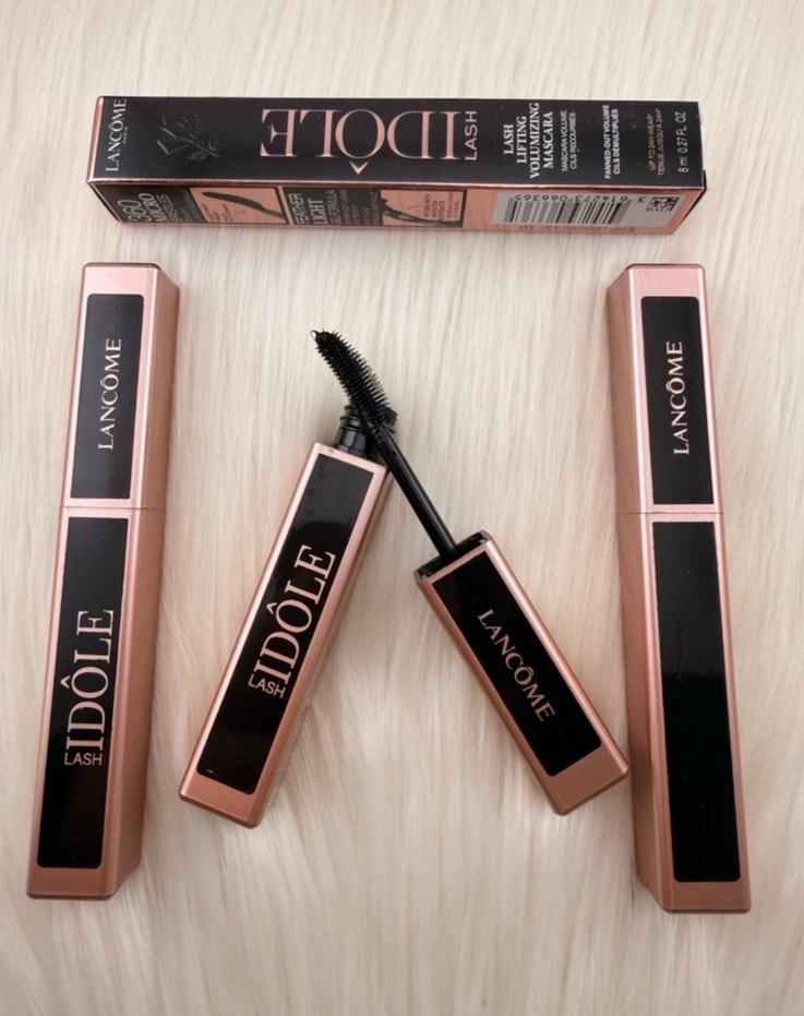 Lancôme Idôle Lash maskara koyu renk ve kıvrık fırçasıyla kirpikleri ayırır ve hacim verir. Bej ambalaj şıklık katıyor.
