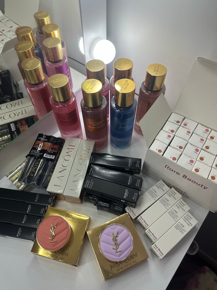 Altın kapaklı farklı renklerde kadın parfümleri ve çeşitli kozmetik ürünleri, rujlar ve kutulu ürünlerle birlikte masada sergileniyor.