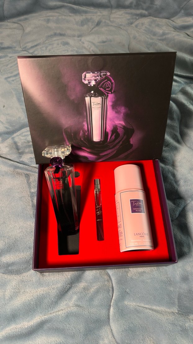 Lancôme kadın parfüm seti, büyük parfüm şişesi, küçük seyahat sprey ve vücut spreyi içerir, şık kutuda sunulur.
