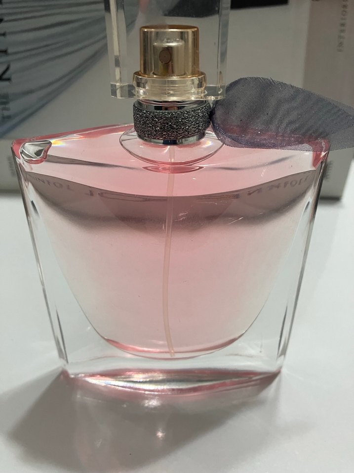 Pembe sıvı içeren, sprey başlıklı ve siyah süslemeli kadın parfümü şişesi. Boyun kısmında koyu renk bir yaprak bulunur.
