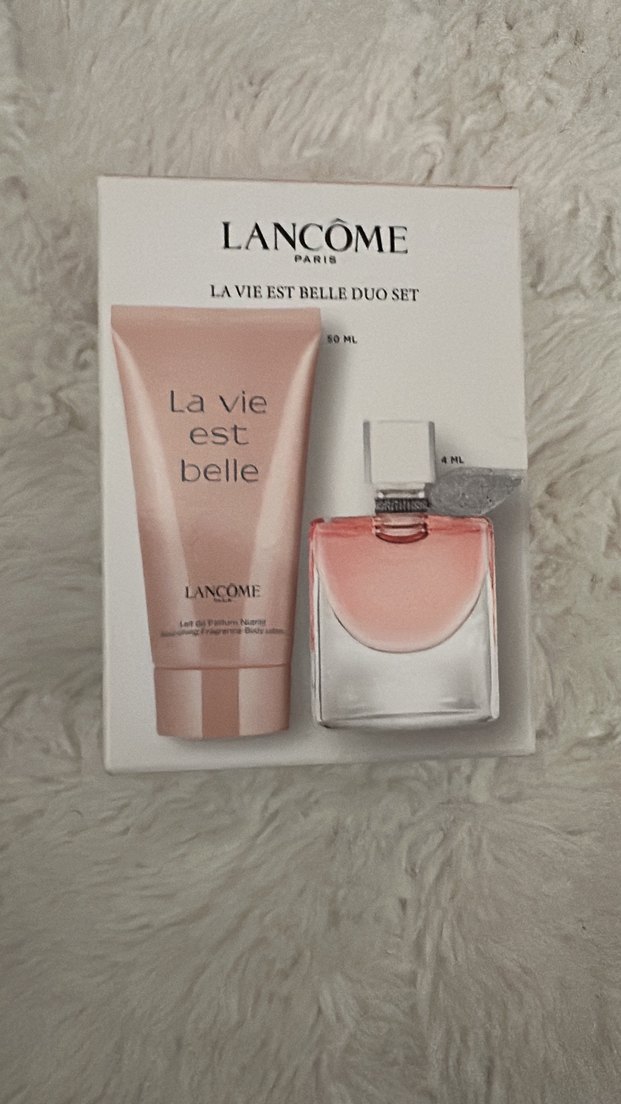 Lancôme La Vie Est Belle duo set, 50 ml losyon ve 4 ml parfüm içerir, çiçeksi ve tatlı bir koku sunar.