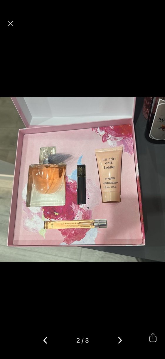 Lancome La Vie Est Belle parfüm seti, büyük parfüm şişesi, vücut losyonu tüpü ve iki küçük parfüm numunesi içerir. Set, dekoratif pembe kutuda sunulmaktadır.