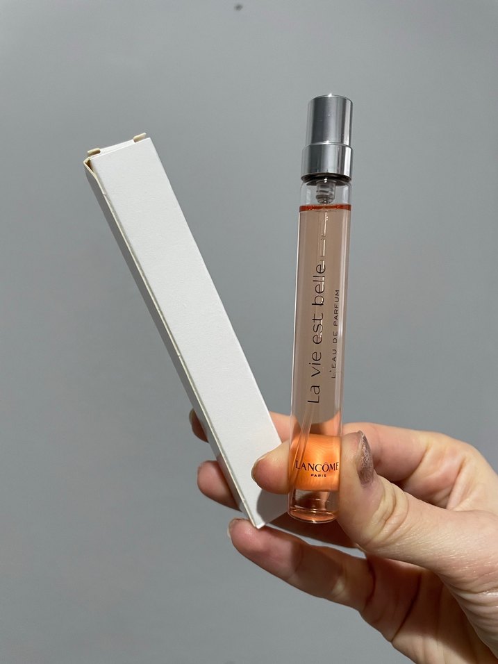 Lancome La Vie Est Belle kadın parfümü, 10 ml sprey şişede. Yanında sade beyaz kutusu bulunmaktadır. Hafif ve feminen kokuludur.