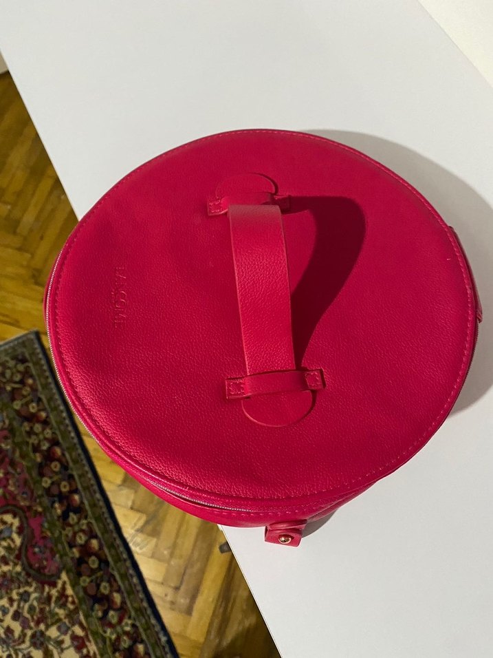 Kırmızı deri ve fermuarlı, yuvarlak tasarımlı Lancôme marka makyaj kadın çantasıdır.