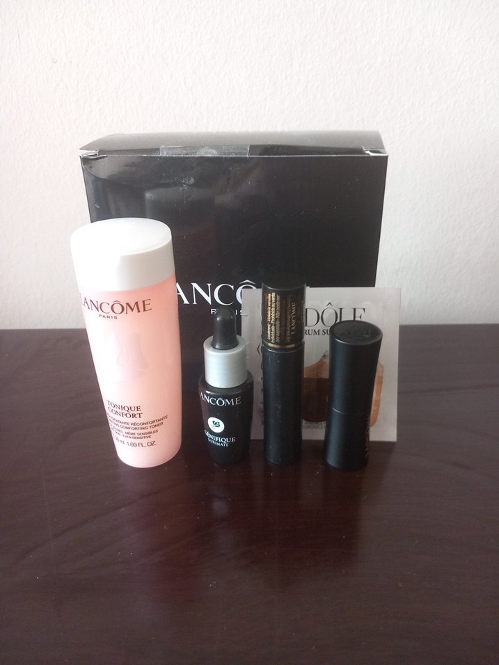 Lancôme makyaj ve cilt bakım seti, toner, serum, maskara ve rujdan ve denemelik fondöten oluşur, şık siyah ve beyaz ambalajda. orijinal faturalı ürün.
