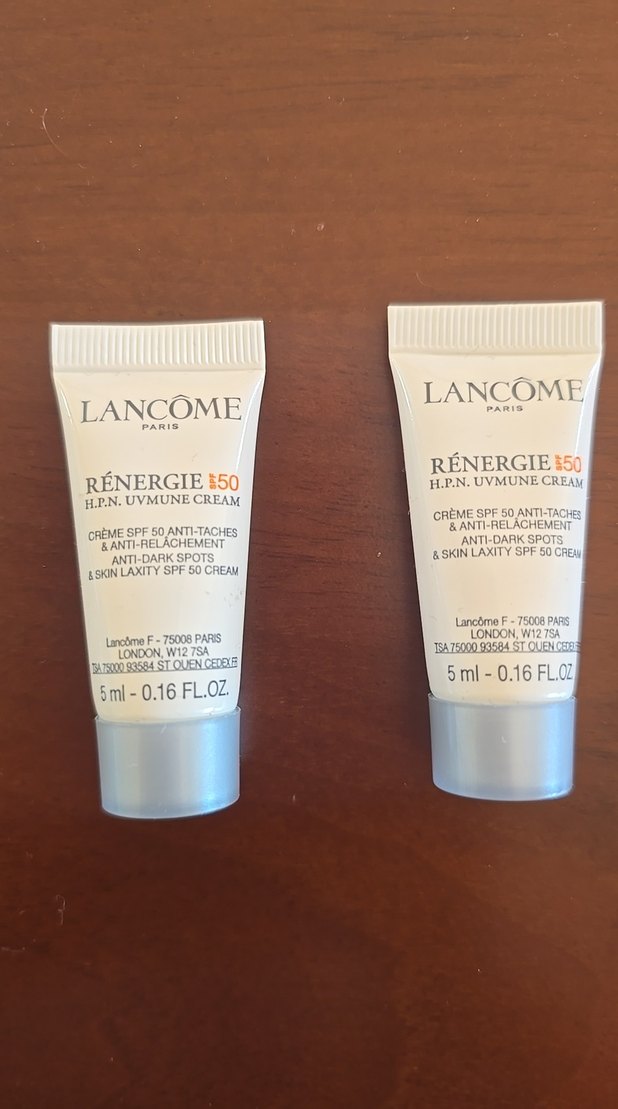 Lancôme Renergie SPF 50 krem, koyu lekeler ve cilt sarkmalarına karşı koruma sağlar. 2 adet 5ml'lik boyda. Toplam 10 ml. Urunu denemel isteyenler icin ideal, hem gunes isinlarindan korurken hem de bakim sagliyor. ☀️