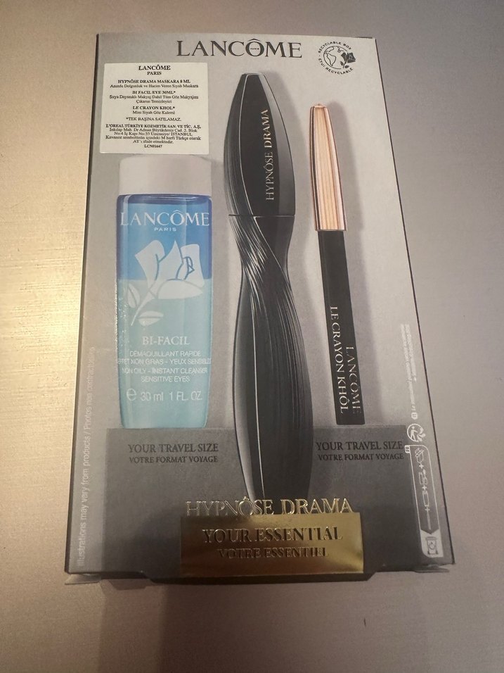 Lancôme set, siyah Hypnôse Drama maskara, makyaj temizleyici ve göz kalemi içerir. Seyahat boyu ürünlerle gözlerinizi ön plana çıkarır.