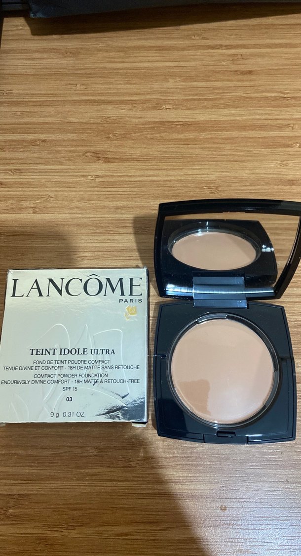 Lancome Teint Idole Ultra kompakt pudra, açık bej tonunda, 18 saate kadar mat ve konfor sağlar. SPF 15 içerir.