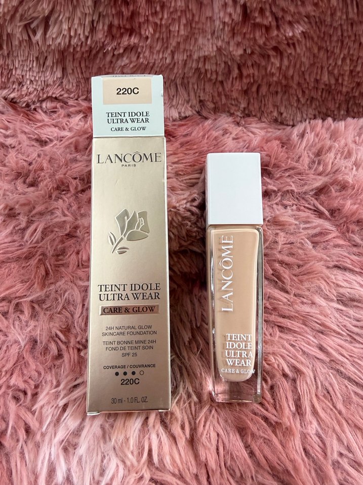 Lancome Teint Idole Ultra Wear fondöten 220C, 24 saat doğal ışıltı ve bakım sağlar, SPF 15 koruması ile açık bej tonunda.