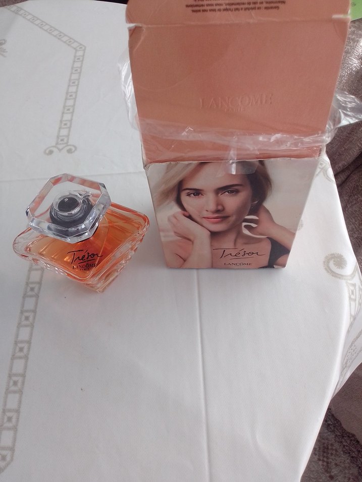 Lancome Tresor kadın parfümü, klasik kare şişe ve şeffaf kapaklı. Yumuşak şeftali renkli kutusunda, zamansız bir koku sunar.