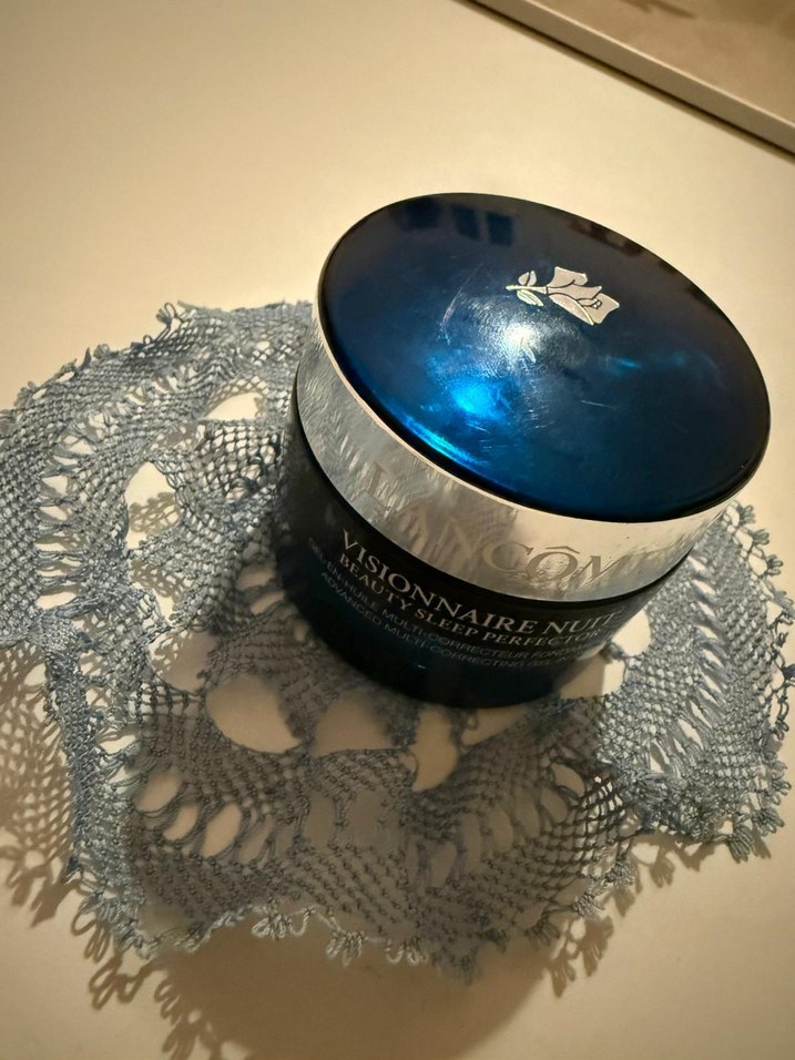 Geceleri cilt bakımı için tasarlanmış, mavi kavanozda ve gümüş kapaklı Lancôme Visionnaire gece kremi.