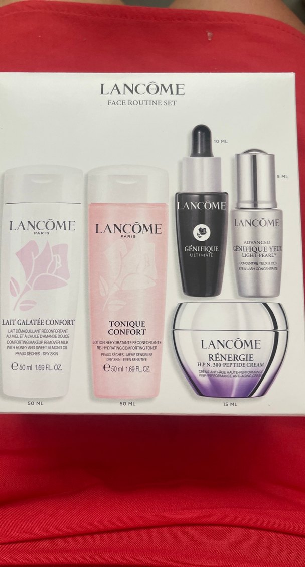 Lancôme yüz bakım seti, hassas ciltler için rahatlatıcı süt temizleyici, nemlendirici tonik, serum, göz kremi ve peptit krem içerir.